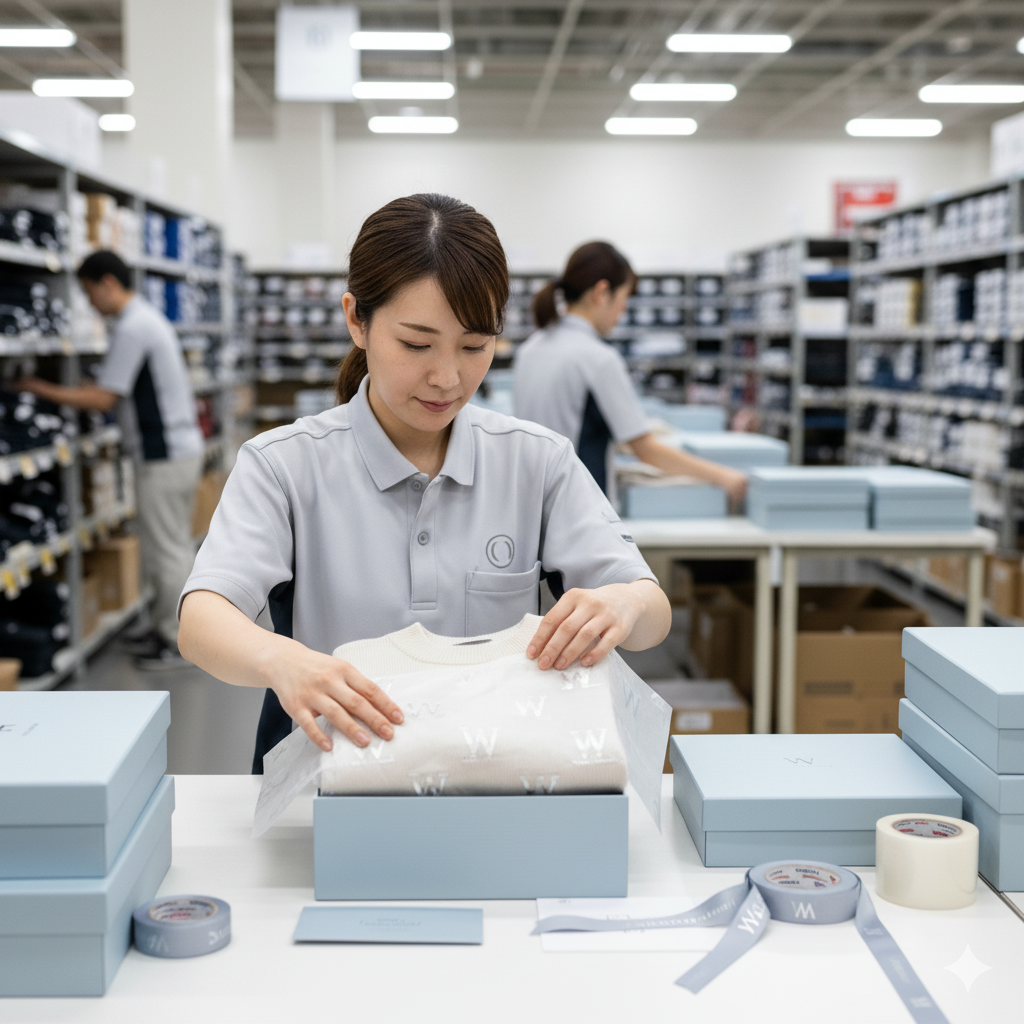 商品の「魅せ方」: 服を単に畳むのではなく、シワにならないようきれいに折りたたみ、ブランドロゴ入りの薄葉紙やOPP袋で包むなど、ひと手間加えます。
